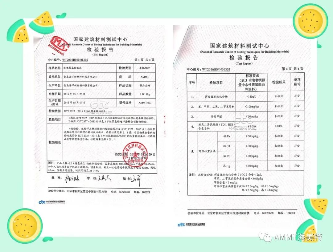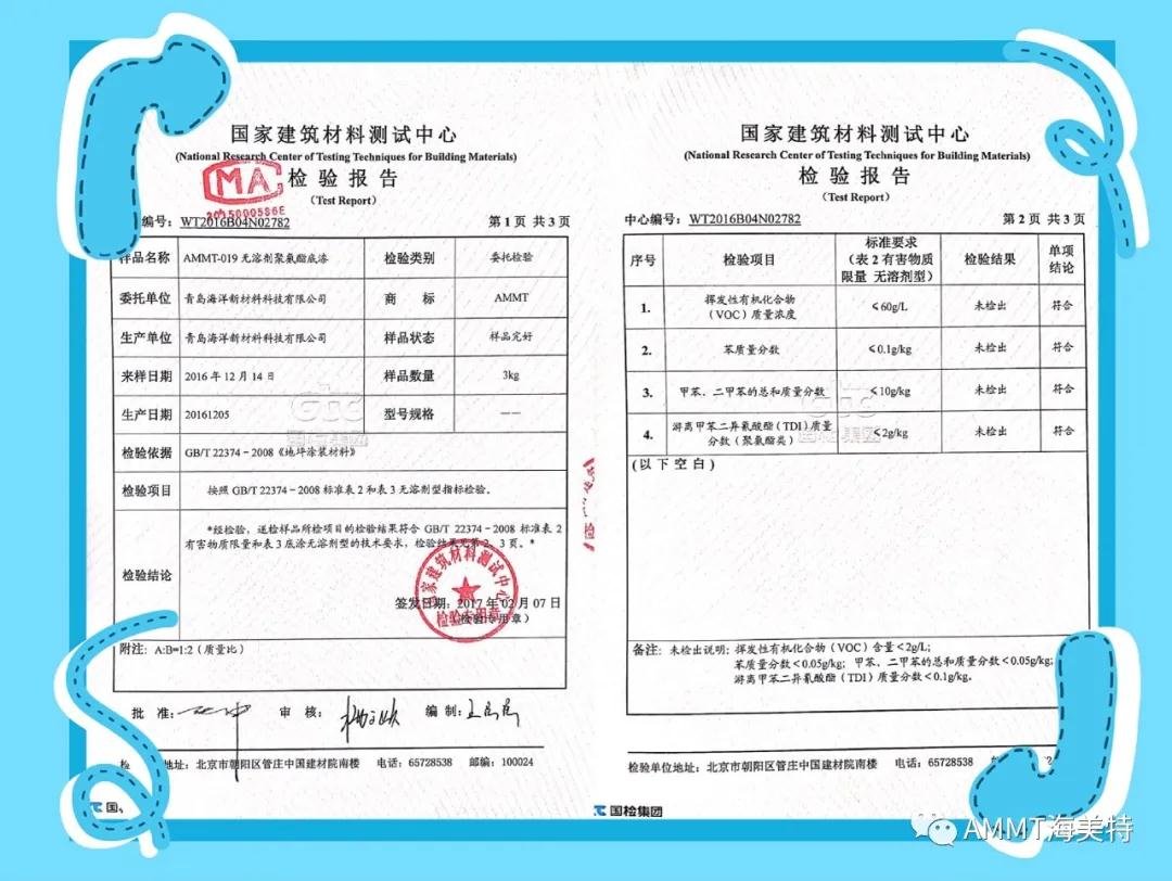 AMMT無溶劑系列產品由異氰酸酯預聚物、改性多元醇樹脂、擴鏈劑、填料和助劑組成的雙組份材料,綠色環保,極低VOC。目前主要產品有:AMMT-045無溶劑聚氨酯地坪材料(包括自流平、防靜電自流平、砂漿自流平等類型地坪材料)、AMMT-046無溶劑聚脲自流平地坪材料、AMMT-019無溶劑聚氨酯底漆、AMMT-326無溶劑環氧底漆等。AMMT無溶劑系列產品經過權威機構檢測均達到新標準環保要求。