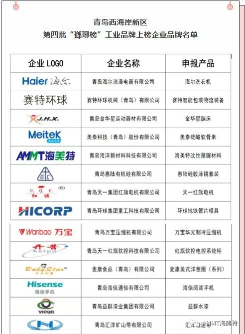 話說:近日,青島西海岸新區公布了第四批“瑯琊榜”工業品牌上榜企業品牌名單,其中青島海洋新材料科技有限公司”等25個企業品牌榮登榜單。