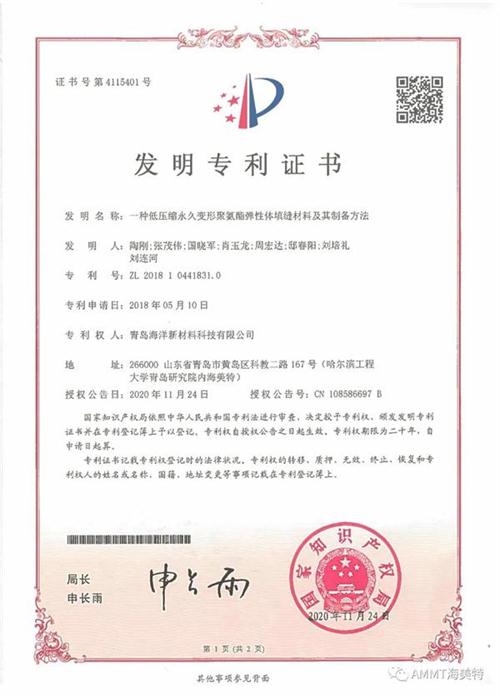 2020年11月24日,青島海洋新材料科技有限公司申請(qǐng)的《一種低壓縮永久變形聚氨酯彈性體填縫材料及其制備方法》發(fā)明專(zhuān)利獲得國(guó)家知識(shí)產(chǎn)權(quán)局授權(quán)。目前,公司共獲得國(guó)家授權(quán)專(zhuān)利32項(xiàng),其中發(fā)明專(zhuān)利29項(xiàng),實(shí)用新型專(zhuān)利2項(xiàng),外觀設(shè)計(jì)專(zhuān)利1項(xiàng)。