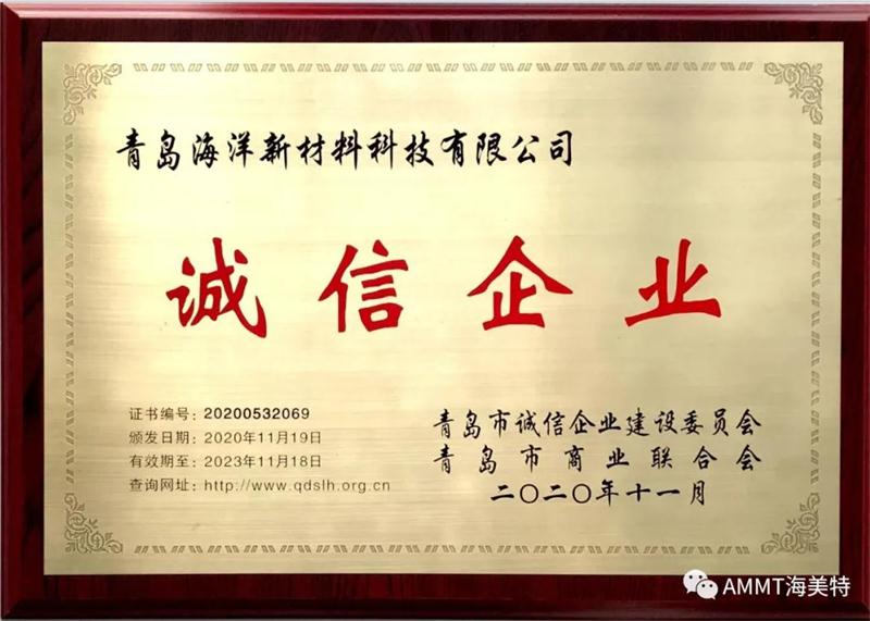 近日,青島海洋新材料科技有限公司參加了青島市誠信企業(yè)認證評選活動,青島市誠信建設(shè)委員會與青島市商業(yè)聯(lián)合會對公司的信用狀況進行了評價,同意授予公司“青島市誠信企業(yè)”的榮譽稱號。這是公司首次獲得該殊榮,對公司進一步推動市場開發(fā)和可持續(xù)發(fā)展有著重要意義。