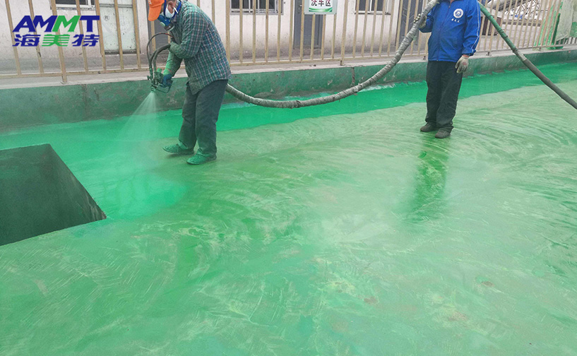 海美特自主研發的第三代噴涂聚脲彈性體材料,通過A組分改性半預聚體與B組分端氨基聚醚、胺擴鏈劑、納米填料、顏料組成,現場噴涂成型。